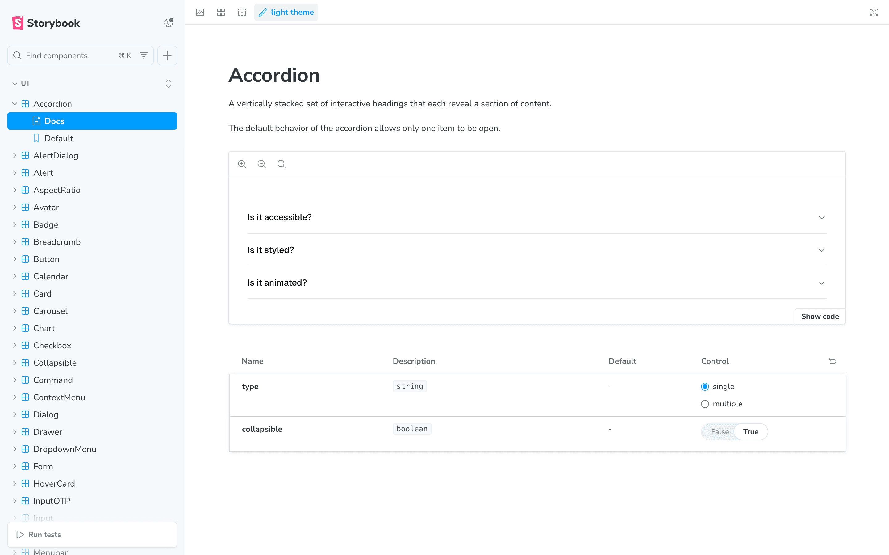 Built-in Storybook instance, allowing you to create reusable components and pages that can be tested and previewed in isolation.